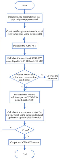 Flowchart of an irrigation pipe network design based on the ICSO-ASV algorithm.