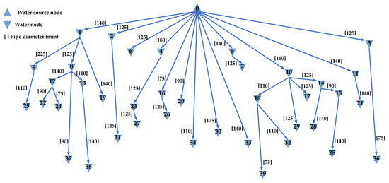 With the expansion of the scale of the pipe network, that is, with an increase in the number of pipe network nodes, the solution space of the improved pipe network planning model increased exponentially and the difficulty of searching for the optimal solution of the model correspondingly increased. To further verify the scalability of the proposed design method, the second case investigated in this paper, pipe network design case II, included one water source point and 39 water-consuming nodes; the parameters of each node are shown in Table 7.