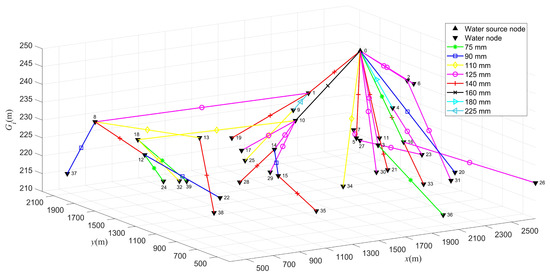 In general, a traditional self-pressure pipe network is composed of a water source point, water-consuming nodes, and connecting pipes between the nodes. Given the location of the water-consuming nodes, the design of a pipe network is equivalent to solving a weighted directed graph problem with the pipe lengths as the edges to satisfy the objective conditions. With the goal of obtaining the lowest investment cost for the pipe network, a pipe network planning model was established based on References [10,11,12,13,23].
