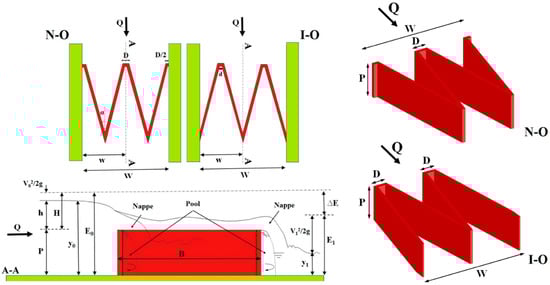 Despite the above literature review, there is still a strong need for fundamental studies of flow over labyrinth weirs and its corresponding characteristics. The present study aims to investigate the hydraulic flow over the composite form of a trapezoidal–triangular labyrinth weirs (TTLW) located in a reservoir with normal and reverse orientations. The main objectives of this study focus on the effects of the geometric parameters on the discharge coefficient, energy dissipation, and downstream flow regime of TTLW. The paper is organized as follows: Section 2 presents the governing equations of free surface flow and main parameters affecting the discharge coefficient and energy dissipation. The description of the laboratory model and the numerical setup are shown in Section 3. Subsequently, details of the verification of the numerical modeling versus the experimental (Section 4) data are presented. Moreover, flow characteristics and discharge coefficients of a TTLW are described and the effects of the geometric parameters, considering two different orientations with respect to the reservoir, on energy dissipation and hydraulics of flow will be analyzed. The paper closes with a discussion on the results obtained.