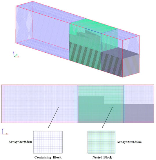The weir setup was performed by inserting a sterolithography (STL) file. The spatial domain was meshed using a structured rectangular hexahedral mesh. A containing mesh block was created for the whole spatial domain, and then, a nested mesh block with refined cells for the area of interest (in correspondence of the weir) was built (see Figure 3). This technique, i.e., a nested mesh block, was adopted from previous studies (see, for example, Ghaderi and Abbasi [33], Choufu et al. [46], and Ghaderi et al. [47]). Considering the geometry dimensions, five computational meshes were tested to select the appropriate one. To this aim, a comparison between simulated and measured free surface profiles for the different meshes was performed (Table 2).