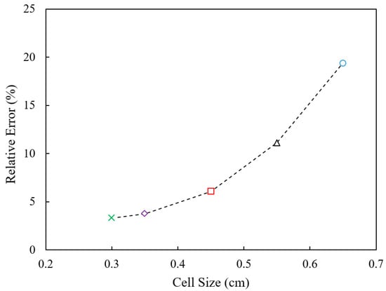 According to Figure 4, which shows the variation of the mean relative error as a function of the cell sizes for free surface profiles, we can see that the simulated free surface profiles exhibit better agreement with the measured free surface profiles for the finer cell size of 0.30 cm. In addition, the variation of mean relative errors can be neglected by decreasing the cell size from 0.35 cm to 0.30 cm. In summary, the cell size of 0.35 cm was selected and there were 598,500 coarse cells (0.8 cm in all directions) and 2,104,958 finer cells (0.35 cm in all directions). To reduce the effect of computational mesh on simulation results, the same mesh was adopted for all models of this research.