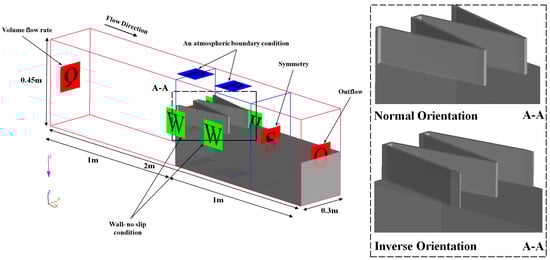According to the experimental conditions, the inlet boundary condition was set to a discharge flow rate (Q; equal to the experimental flow exit discharge) and outlet (O) flow conditions were applied to the downstream boundary. Wall roughness has been neglected due to the small roughness of the material of the experimental facility (plexiglass) used for validation. The lower Z (Zmin) and both of the side boundaries were treated as rigid walls (W). No-slip conditions were applied at the wall boundaries, treated as non-penetrative boundaries. An atmospheric boundary condition was set to the upper boundary of the channel: the flow can enter and leave the domain as null von Neumann conditions are imposed on all variables, except for pressure, set to zero (i.e., atmospheric pressure). Symmetry boundary conditions (S) were used at the inner boundaries as well. Figure 5 shows the computational domain of the present study and the associated boundary conditions.