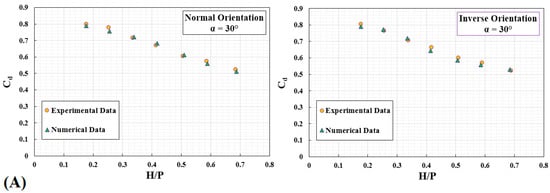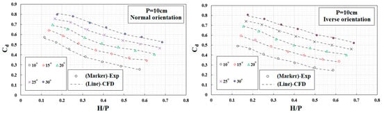 The behavior of Cd with H/P for the weirs of different orientations, obtained from experimental and numerical results, is shown in Figure 9. It can be noted that the trend of discharge coefficient for normal and inverse orientation is the same and Cd decreases by decreasing the sidewall angle.