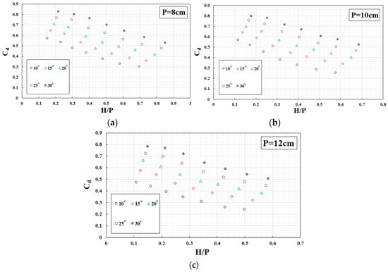 Experimental results obtained for the effects of weir geometry on variations of discharge coefficient Cd versus H/P, (a) P = 8 cm, (b) P = 10 cm, (c) P = 12 cm.