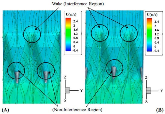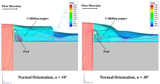 According to Crookston [49], nappe interaction occurs when two or more nappes collide. It can be seen that Cd decreases by increasing the weir heights due to nappe interaction. In fact, the nappe interaction increases with discharge, leading to a decrease in discharge coefficient Cd of the TTLW. For TTLW, nappe interference originates at the upstream apex and can produce wakes downstream of the apex (Figure 8). It can be stated that for triangular shape, downstream of the apex, nappe interactions do not happen.