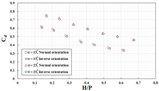 Variations of discharge coefficient Cd with H/P in normal and inverse orientation.