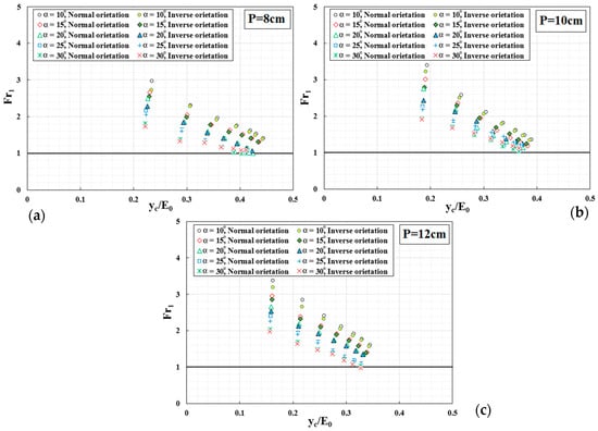 Downstream Froude number (Fr1) versus the relative critical depth yc/E0, (a) P = 8 cm, (b) P = 10 cm, (c) P = 12 cm.