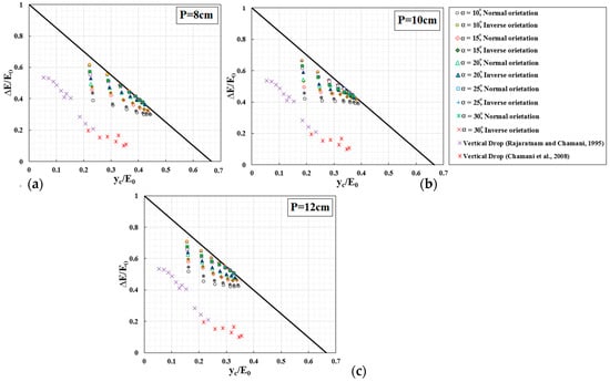 Energy dissipation on TTLW with vertical drop and maximum energy dissipation [31] (∆E/E0 versus yc/E0), (a) P = 8 cm, (b) P = 10 cm, (c) P = 12 cm.