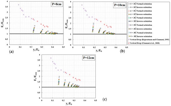 Comparison of the residual energy downstream of TTLW with a vertical drop, and minimum residual energy (E1/Emin versus yc/E0), (a) P = 8 cm, (b) P = 10 cm, (c) P = 12 cm.