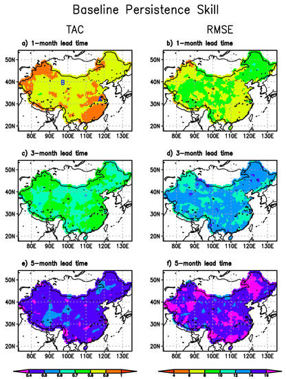 Although the design of SPI has effectively removed the seasonality in precipitation, the persistence forecast skill and the contribution of the CFSv2 model to the drought forecast skill can still vary significantly with season and lead time. Figure 5 illustrates such variations with correlation coefficient and RMSE over two selected locations indicated in Figure 1a. These two locations are selected to represent two different climate zones. They are identified based on the watershed divisions and the Köppen–Geiger climate types (Peel et al. [30]) where China was divided into 17 large hydroclimatic regions (Lang et al. [18]). Location A is in the lower Yangtze River basin with a humid climate and annual precipitation about 1600 mm. Location B is in the semi-arid/arid northwest China with a dry climate and annual precipitation about 200 mm. During the cold-and-dry season (e.g., November to January), the persistence forecast can still be skillful at long lead times; however, during the warm-and-wet season (e.g., June to August), the skill drops quickly with lead time, especially at location B where rainfall during spring and summer experiences a stronger inter-annual variability than the prior season.