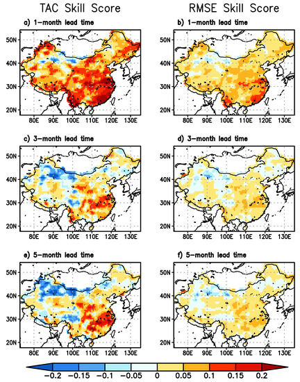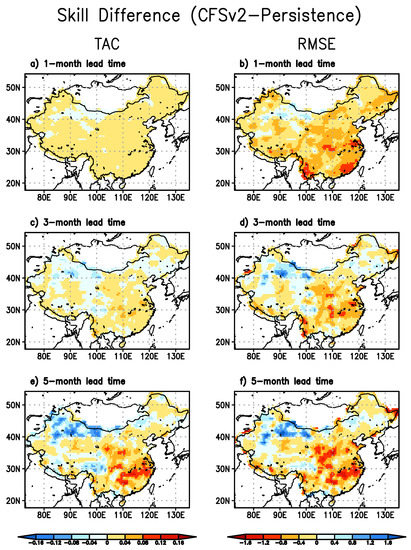 At longer lead times, as the CFSv2 precipitation forecast takes a bigger portion of the six-month total precipitation, the impact of CFSv2 forecast on the SPI6 forecast skill is expected to be greater. As shown in Figure 2, similar patterns of difference are observed but the difference is only more pronounced. The humid southeast generally shows larger increases in TAC especially at the five-month lead time. Reduction in RMSE also shows up in this region at all lead times. Over the semi-arid northwest, even larger decreases in correlation and increases in RMSE suggest a further degradation of skill in this region when CFSv2 forecast is included. Overall, CFSv2 forecast contributes positively to the skill of drought forecast with SPI6 over most regions in China at all lead times, mainly in northeast, southeast, and southwest of China, and the contribution is more significant at longer lead times.