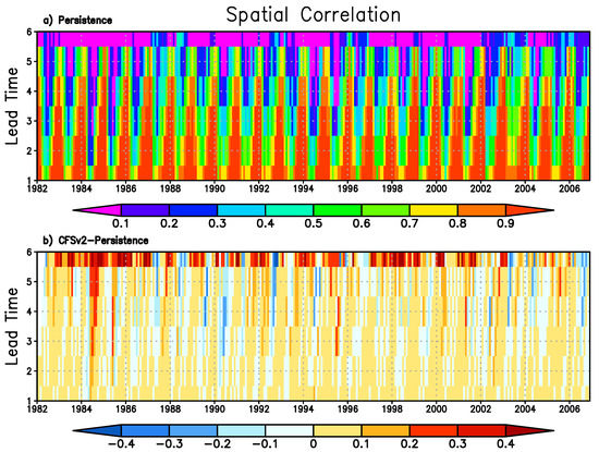 The spatial anomaly correlations of all 300 forecasts (horizontal axis) with six lead times (vertical axis) from the persistence forecast (a) and the differences between the CFSv2 forecast and persistence forecast (b).