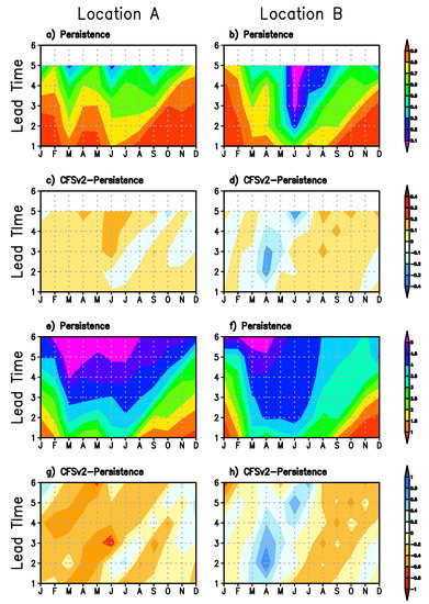 As shown in Figure 5, the contribution from the CFSv2 forecast to the drought forecast skill is mostly positive at all months and all lead times at these two locations. Negative contributions are seen in several month-lead combinations. The particular pattern of these combinations seem to suggest that the certain ensemble forecast runs from CFSv2 may have had abnormally poor performance. For example, at location B, June SPI6 forecast at the five-month lead time includes precipitation for February through June from forecast runs initialized between January 11 and February 10. These runs cause the CFSv2 forecast skill to be worse than that of the persistence forecast. The same forecast runs also contribute negatively to April SPI6 forecast at the three-month lead time. The cause of such poor model performance is beyond the scope of the study, nonetheless, identifying such problems could help model developers to conduct more focused diagnosis to improve the model.