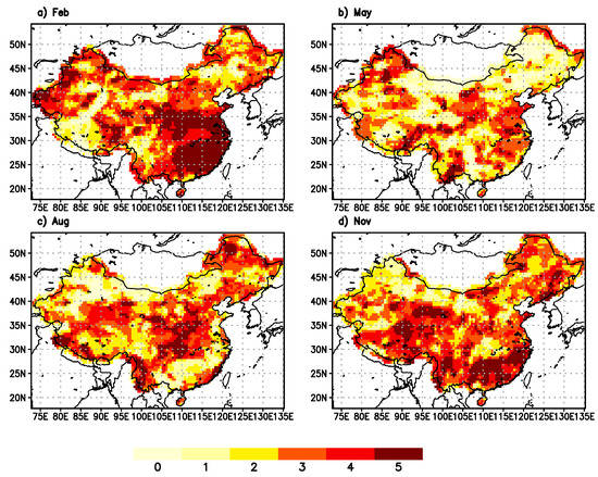 In February (target period: September to February), the CFSv2 forecast can add values to seasonal drought prediction for up to five months in a vast area in the east and southeast region, while the rest of the country also benefits from CFSv2 forecast for two to four months. Only a few spots in the northeast and Tibet region show no contributions from CFSv2 forecast. In May (target period: December to May), much larger areas in the north and northeast part of the country shows no contributions from CFSv2 forecast. Then, in August (target period: Mar to August), drought forecast over the central part of the country can benefit from CFSv2 forecast for up to five months, and finally in November (target period: June to November), this area shifts again to the southeast.