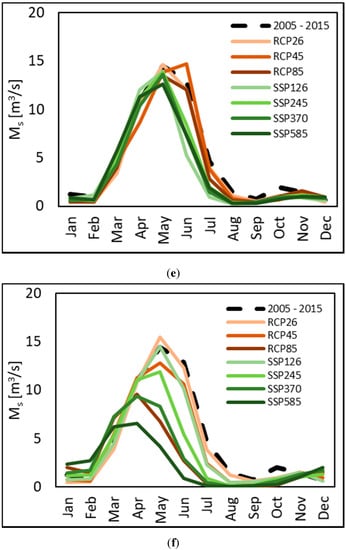 Projected mean monthly values of energy production E (GWh), discharge Q (m3 s−1) and snow melt Ms (m3 s−1). Each line displays the value for a given RCP/SSP, averaged for all GCMs (CMIP5/CMIP6). (a) E period P1. (b) E period P2. (c) Q period P1. (d) Q period P2. (e) Ms period P1. (f) Ms period P2.