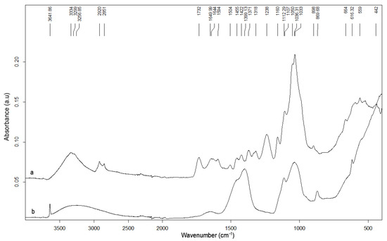 Infrared spectra of the yerba mate (YM) (a) and calcinated yerba mate (CYM) (b) samples.