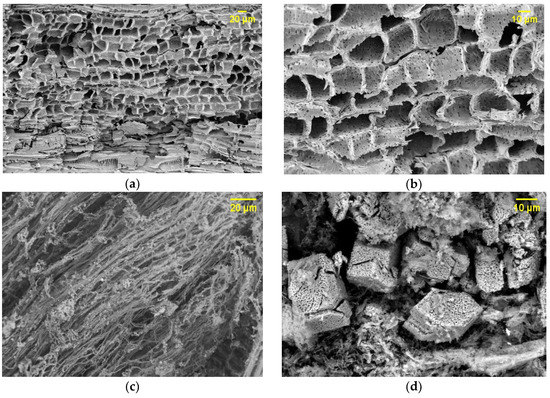 In the FE-SEM micrographs of YM shown in Figure 2a,b, a coarse surface topography with a large number of pores can be observed. This morphology could provide the dye with a greater dye adsorption capacity by such bio-adsorbents due to the capture of contaminants in its irregular internal surface area. The internal structure of the calcinated YM (CYM) was different, and a fibrous aspect (Figure 2c) with a large prismatic hexagonal crystal of calcium hydroxide (Figure 2d) can be clearly detected.