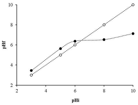 Zero charge point (pHpzc) of YM, determined by the pH drift method. The zero charge point is represented by the intersection of the two curves: the black dotted (●) curve shows the final pH (pHf) of the suspension with respect to the initial one (pHi); the white dotted curve (o) represents the condition pHi = pHf.