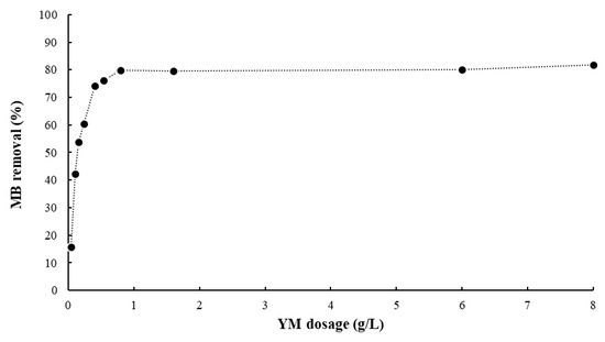 Methylene blue (MB) adsorption removal efficiency after 72 h of equilibrium tests at different YM dosages. Conditions: 20 mg/L of MB, 50 mL of volume, pH = 6 and 25 °C.