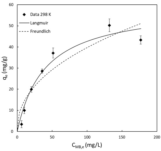 Langmuir and Freundlich isotherms obtained by a non-linear fitting of the adsorption data of MB using yerba mate at 298 K. The error bars represent the standard deviation.