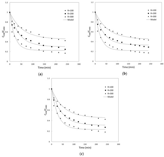 The characteristic time τ (min), as clearly noticeable in Equation (15), depends on the concentration of the bio-adsorbent, specified by xs (mg/L), and the temperature (intrinsically contained in qmax b and kC α). By means of Equation (15), derived from the model expression, the characteristic time τ (min) was calculated for the tests at 283 K, 293 K and 313 K, using for each test the values of qmax b and kC α derived from fitting. Since it has been previously observed that temperature did not significantly influence the values of the constants qmax b and kC α, the variation in τ was reported only in the function of R in Figure 9. As expected, the characteristic time of adsorption decreased when the concentration of the solid adsorbent increased. More precisely, by doubling the amount of solid adsorbent (from R = 100 to R = 200), the characteristic time of adsorption was reduced by 15 min; by tripling the amount of solid adsorbent (from R = 100 to R = 300), the characteristic time of adsorption was reduced by 30 min.