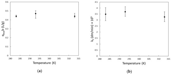 Variation of the parameters of fitting qmax b (a) and kC (b) with temperature. The points reported are the means of the fitting values. Moreover, the error bars represent the maximum and minimum difference between the values of fitting and the mean.