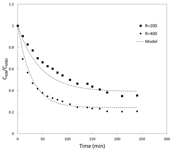where Di (m2/s) is the effective diffusivity of the component I, and Rp (m) is the radius of a particle of the adsorbent material. By means of Equation (14), DMB was calculated using kC = 3.5 × 10−5 (dm/min), which is the mean of all the values of kC obtained from the fitting (see Figure 7), and Rp = 1 mm (average size of solid particles). It resulted in DMB = 0.16 × 10−10 m2/s, which is more than one order of magnitude less than the diffusivity of MB in water [53]. Such a significant decrease could be attributed to the resistance of pore diffusion of MB into the bio-adsorbent.