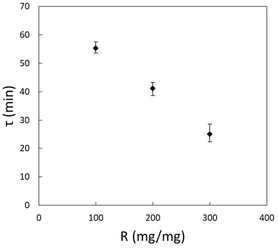 Variation in the characteristic time of adsorption of methylene blue using yerba mate versus R. The points reported are the means of the fitting values. Moreover, the error bars represent the maximum and minimum difference between the values of fitting and the mean.