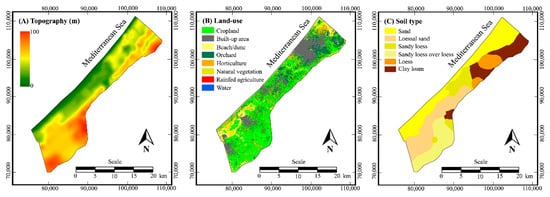 Maps of the Gaza Strip showing topography (A), land-use (B), and soil types (C).