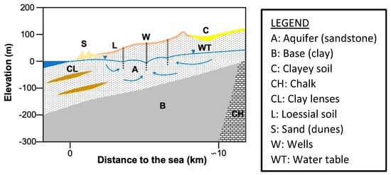Schematization of the hydrogeological cross-section of the Gaza aquifer (adapted from [31,32]).