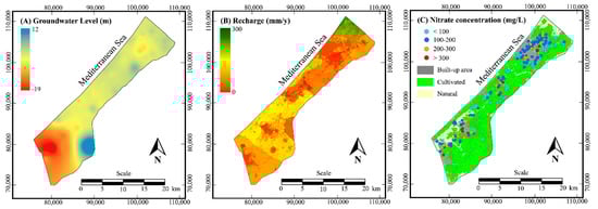 Maps showing observed groundwater level in 2015 (A), estimated groundwater recharge (adapted from Zomlot [34]) (B), and observed groundwater nitrate concentration in 2016 (C).