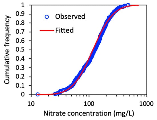 Cumulative frequency distribution of the observed groundwater nitrate concentration and fitted lognormal distribution.