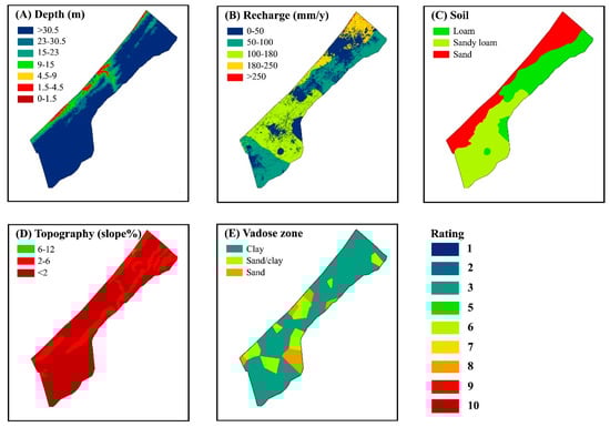 Spatial distribution of the DRASTIC factors: depth to the groundwater (A), groundwater recharge (B), soil texture (C), topographic slope (D), and impact of the vadose zone (E); also shown is the color scale for the rating values.