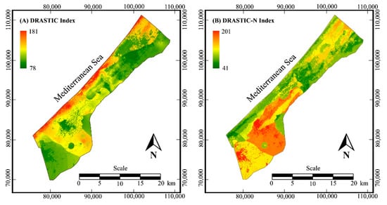 The following applications of DRASTIC in the Gaza Strip were presented in the literature. Baalousha [21] applied DRASTIC with adjusted ratings in the Gaza Strip. In the northwest, high DRASTIC index values were obtained, which were attributed to the sandy soil and the large amount of groundwater recharge. A poor correlation with nitrate concentration in groundwater was obtained, which could be improved if land-use is taken into account. Almasri [9] applied the DRASTIC model in the Gaza Strip, but the classification of factors and assignment of the corresponding rating were not well explained. These results indicate that most of the Gaza Strip can be designated as moderately vulnerable with high vulnerability zones located only along the coast. No conclusive relationship could be found between nitrate concentration and groundwater vulnerability and this did not improve when land-use was included. Al Hallaq and Elaish [22] applied DRASTIC in the Khan Younis Governorate of the Gaza Strip using modified ratings, concluding that the aquifer vulnerability to contamination is high along the coast due to the shallow groundwater, moderate to high groundwater recharge and permeable soils.