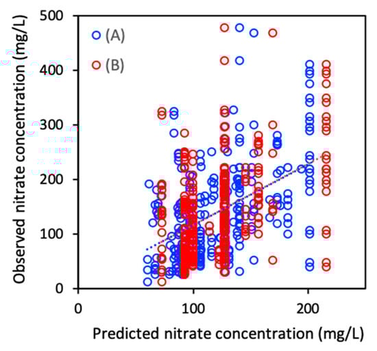 Observed nitrate concentration versus nitrate concentration predicted by linear regression with all DRASTIC factors and land-use classes (A), and with statistically significant DRASTIC factors and land-use classes (B).
