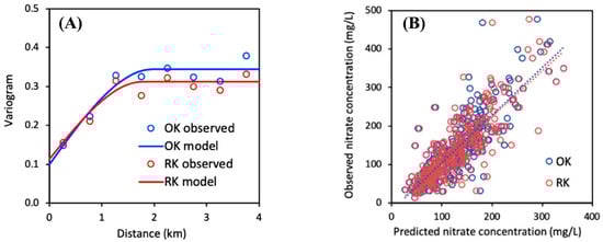 Empirical variograms of log-transformed nitrate concentration and fitted spherical models (A), and cross-validation of the variogram models (B), for ordinary kriging (OK) and regression kriging (RK).
