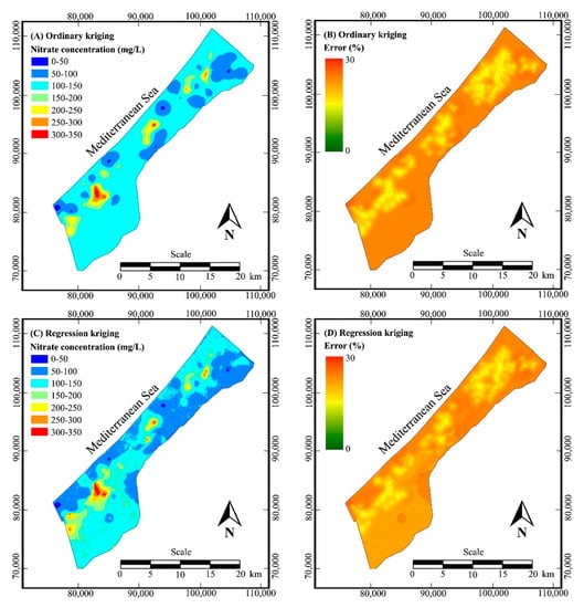 When the map obtained by regression kriging interpolation is compared with the map obtained by ordinary kriging interpolation (Figure 9A,C), several contrasts and details stand out as one can distinguish topographic ridges, soils types, built-up areas, etc., which were previously not noticeable. These environmental factors apparently play a role in the occurrence and spatial distribution of the presence of nitrate in groundwater. The error maps (Figure 9B,D) also indicate the influence of explanatory factors for predicting the nitrate concentration. In places where significant additional information is available, for example sandy loam soil in the southeast of the Gaza Strip, the error obtained with regression kriging is smaller than the error obtained with ordinary kriging.