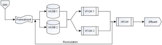 The two VFCWs work alternately every 3.5 days, a configuration that helps to prevent clogging, as pointed out in some works [20]. At the VFCW outlets there is a recirculation system that pumps a fraction of the treated water back into the entrance of the HUSB. This recirculation is included to improve nitrogen removal by processing the nitrates generated in the VFCWs by the two HUBS in the first stage. The reminder of the treated water is driven to the HFCW. The effluent released from the HFCW is directly poured into the sewerage system of the facility, with parameters according to the regulations.
