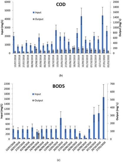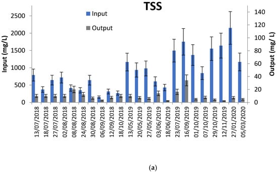 Figure 3 shows organic matter at the input and output of the plant. The input concentrations are showed in blue bars and output concentrations appear in grey bars. When each parameter is analyzed, we can see than the TSS input concentration presents values higher than 2000 ± 273 mg/L, as it may be seen in Figure 3a. However, the output concentrations show values lower than 20 ± 5 mg/L during the whole study period. This means that the removal efficiencies achieve 98.47 ± 0.53% at the plant outlet, as shown in Table 5. It should be mentioned that, most of TSS are removed at the pretreatment and at the HUSB, approximately 71.02 ± 9.71% (see Table 3). With regards to organic matter, Figure 3b,c shows input and output concentrations of COD and BOD5, respectively. COD achieves input values of 4300 ± 954 mg/L and output concentrations lower than 230 ± 57 mg/L. So, a load removal efficiency of 91.22 ± 2.80% is achieved. HUSB and VFCW outputs show COD removal efficiencies higher than 60.66 ± 9.10% and 86.55 ± 4.73%, respectively. The BOD5 removal efficiency presents a pattern similar to that of COD, but now the input concentration achieves maximum values of 1672 ± 501 mg/L, and output concentrations lower than 80 ± 24 mg/L, with a load removal efficiency of 95.60 ± 2.67%. It is worth noting that the VFCW output achieves a removal efficiency of 84.00 ± 5.00%, while that of the HUSB presents a value of 56.67 ± 12.96%. This high efficiency was obtained because, as commented upon in Section 2, during the residence time sedimentation, filtration and absorption take place in the reactor, which allows suspended solids to be retained and organic matter to be totally or partially biodegraded. In addition, organic matter is also consumed in the denitrification processes carried out.