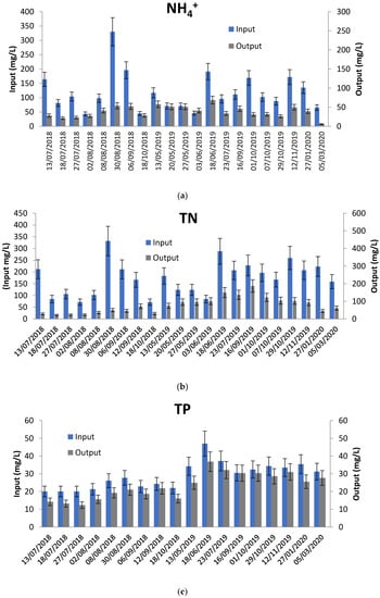 With regard to nutrients, Figure 4 shows nutrient concentrations at the input and the output of the depuration system. NH4+ concentrations (Figure 4a) achieve input values of 330 ± 49 mg/L and output concentrations lower than 68 ± 10 mg/L. Therefore, these values provide a load removal efficiency of 61.00 ± 9.26% (see Table 5). Ammonium removal is carried out in the VFCW, due to the aerobic character of the medium, which enhances the nitrification that takes place in this phase of the depuration process. Ammonium removal is hardly carried out in the HUSB, as only particulate ammonia is removed inside it, which represents a low percentage of the total incoming ammonia. Table 4 shows that the NH4+ removal efficiency at the VFCW outlet achieves a mean value of 45.06 ± 6.99% in this stage of the depuration process. This table shows that the mean value of total nitrogen removal efficiency was 52.79 ± 10.45%. This is due to the vertical flow and the bed height of the reactor, which provide an aerobic process at the top of the bed with nitrification and anoxic and anaerobic conditions at the bottom. This stratification in the bed makes it possible to reach nitrogen removal efficiencies higher than those of ammonia and is also an important biological phosphorous removal process.