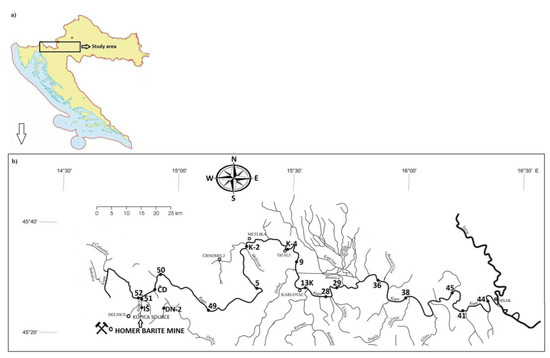 (a) Location of the study area; (b) Position of barite mine and sampling stations along the Kupa River.