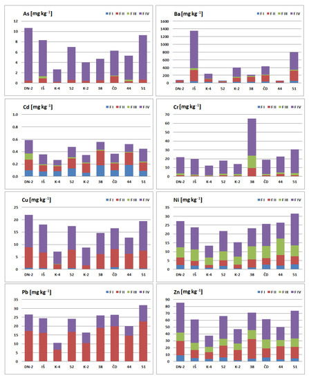 The least mobile elements are Cr and Ni since the significant content of these elements in addition to the F4 is bounded in the F3 (slightly lower percentage). In addition to being mostly bound in F4, As, Cd, Cr, Cu, Ni, Ba, and Zn are bound in F2 in some localities, indicating the importance of Fe and Mn oxides as well as the carbonates for the binding of these elements.