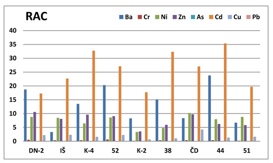 The results of the risk assessment codes with values given as percentages of the F1 fraction are shown in Figure 3. The sediments do not pose a high risk to the environment. The obtained results show that 3.31–23.76% of Ba, 0.16 to 0.64% of Cr, 3.36 to 10.22% of Ni, 3.56 to 10.56% of Zn, 17.23 to 35.32% of Cd, 0.67 to 4.22% of Cu, and 0% of As and Pb were present in exchangeable fractions. Ba showed light-medium risk; Cr, no risk; Ni, light-medium risk; Zn, light-medium risk; Cd, medium-high risk; Cu, no-light risk; and As and Pb, no risk to the local environment. The more easily mobile and bioavailable forms were predominant for cadmium and barium. A potentially dangerous situation in this area can derive mainly from Cd due to its toxicity and from Ba due to its very high concentrations.