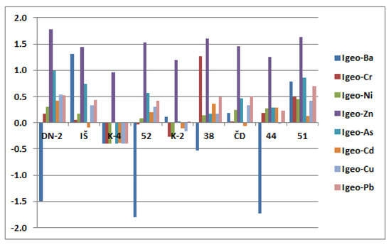 The greatest number of elements belongs to Class 0 and Class 1 (Figure 4), i.e., uncontaminated and uncontaminated to moderately contaminated sediments (Ba, Ni, Zn, As, Cd, Cu, Pb, and Cr), and Class 2—moderately contaminated sediments (Zn, Ba, and Cr in some samples).