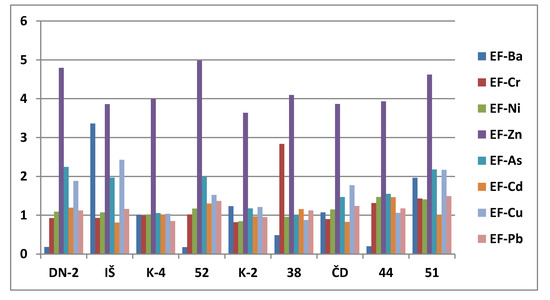 For calculation of EF, Al was used as the element for normalization. The EF values were calculated separately for all the sampling sites and results are shown in Figure 5. In general, in most localities and for most elements, the EF factor value is less than three, indicating no to minor enrichment. The highest values of EF factors were observed for Zn and have values between 3 and 5, indicating moderate enrichment with this element at all of the localities. At the locality marked with IŠ, the EF value for Ba is also slightly higher than 3, but only at that locality. The locality at which the increased barium content was observed is the Kupica River sediment, at a distance of 1.5 km upstream from its mouth in the Kupa River. As shown in Frančišković-Bilinski [12], the source of this Ba-contamination was an abundant barite mine in the Homer-Lokve area. Also, a slightly higher value of the EF factor for Cr was observed at locality 38 (Kupa, Sunny Beach near Pokupsko) rather than other localities, but the value was less than 3, indicating minor enrichment. These results are consistent with Igeo values.