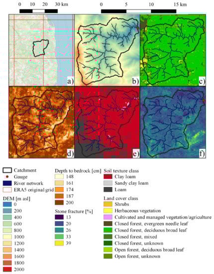 Outlook on the input datasets (WGS-84 Pseudo-Mercator projection) for Alto river–Taglio–Isolaccio (42.44° N 9.47° E, Corsica, France): ERA5 [15] grid tiles with OpenStreetMap as background [66] (a); digital elevation model based on SRTM30 [65] (b); Global Land Cover [21] classes (c); SoilGrids250 [22]—depth to bedrock (d), soil texture classes (7th layer) (e), and soil coarse fragment fracture (7th layer) (f).