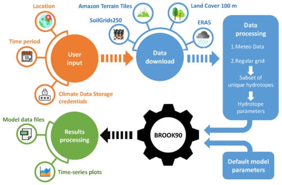 The package workflow consists of five milestones (Figure 3): input from user (1), data download (2) and processing (3), BROOK90 application (4), results postprocessing and storage (5). Therefore, four core files (data_downloader, data_processing, model_hydrotope, and brook_framework) and the following main functions are implemented: