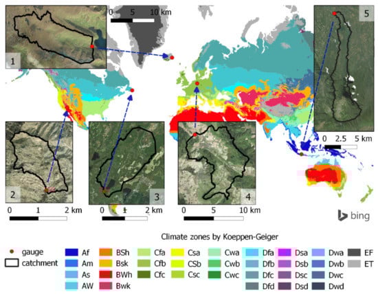Outlook on the chosen catchments (WGS-84 Pseudo-Mercator projection) with Koeppen–Geiger world climate zones [91] and Bing images [92] as background. Numbers near the catchments refer to Table 2.