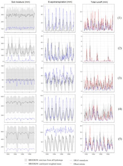 BROOK90 [23] is a physical lumped hydrological model with a special focus on a detailed representation of vertical water fluxes within the soil–water–plant system at a single site.